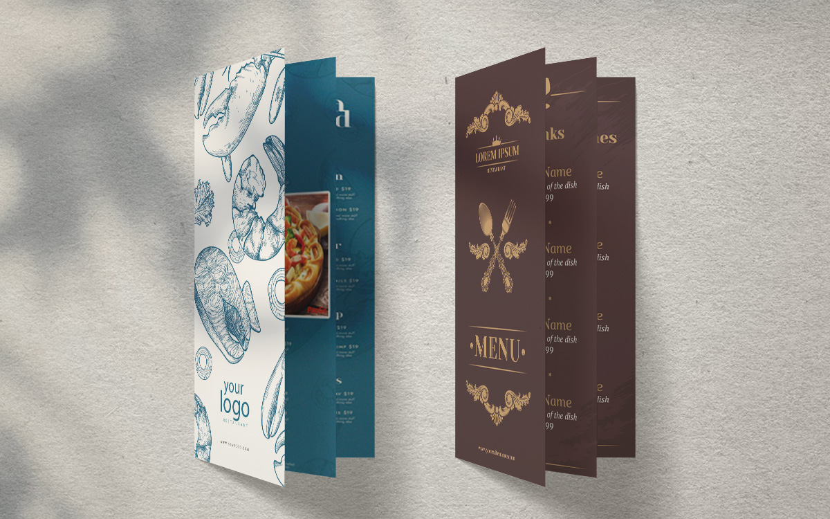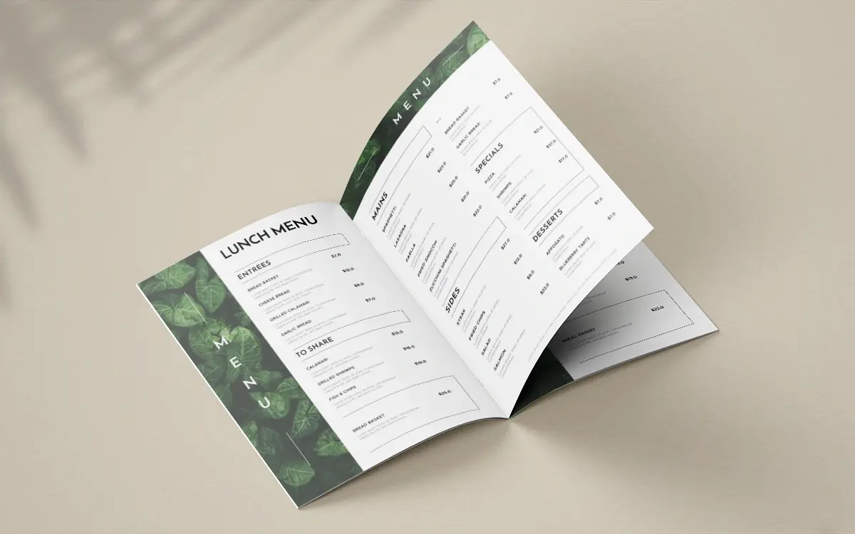 Μενού με 4 ή περισσότερες σελίδες και εξώφυλλο σε διάφορα είδη χαρτιών ή σε αδιάβροχα υλικά. Επιιλέξτε χαρτί από την γκάμα που σας προσφέρει το PrintBay ή αδιάβροχο υλικό αν χρειάζεστε αδιάβροχα μενού και τυπώστε την επιθυμητή ποσότητα στον επιθυμητό χρόνο. Για ακόμη πιο εντυπωσιακό αποτέλεσμα επιλέξτε γυαλιστερό τοπικό uv στα σημεία που σας αρέσει.